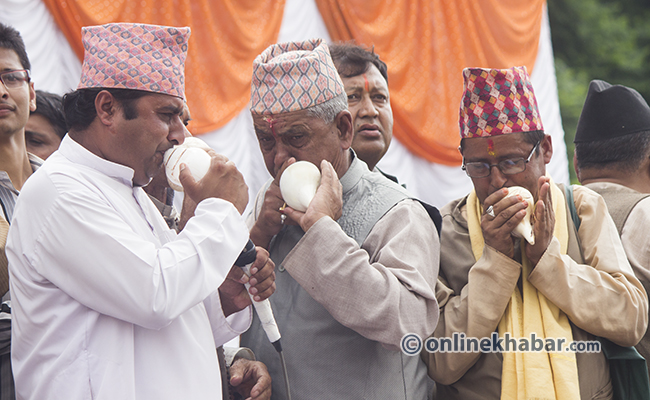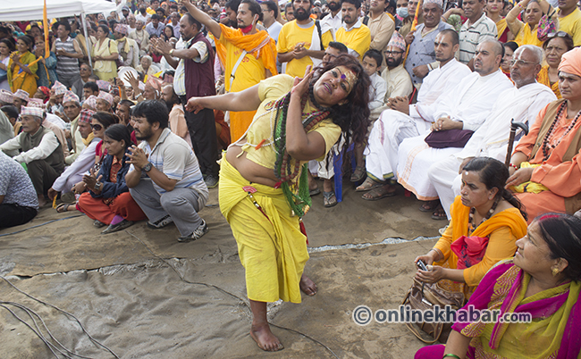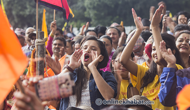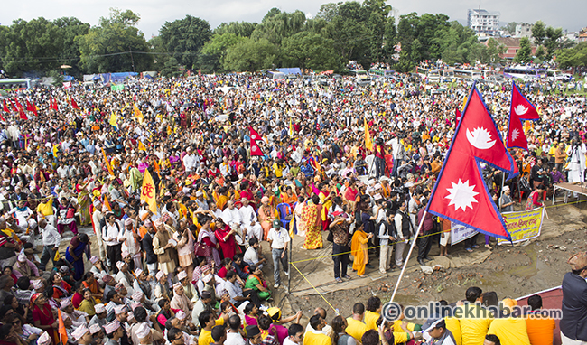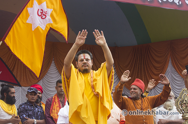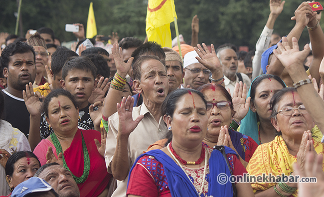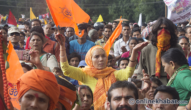 २२ साउन, काठमाडौं । नेपाललाई हिन्दू राज्य कायम गरिनुपर्ने माग गर्दै शुक्रवार काठमाडौंमा वृहत प्रदर्शन भएको छ । स्वामी कमल नयनाचार्य सहित हिन्दू धर्मका बिभिन्न धर्म गुरुहरुको अगुवाइमा भएको प्रदर्शन खुलामन्चमा पुगेर आमसभामा परिणत भएको थियो ।